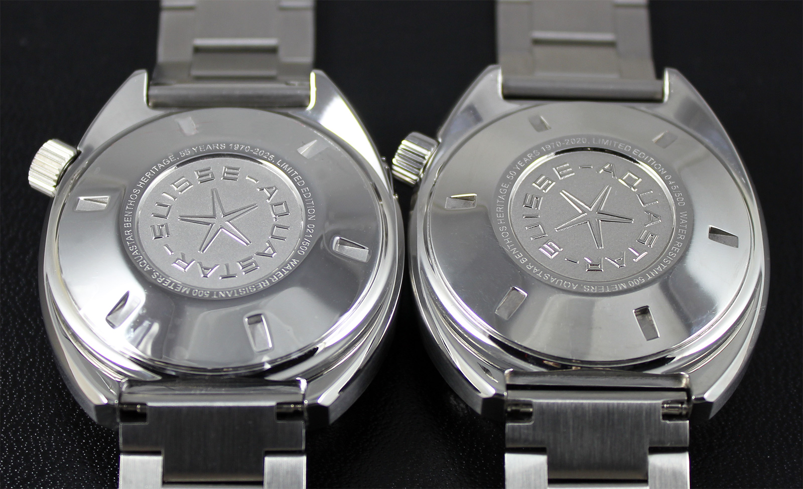 Are they exactly the same watch? Well, obviously one has a black dial and bezel and the other has a blue dial and bezel but there are also other subtle differences. I already mentioned the crowns and the lume above and if you flip the watches over you will see the casebacks have different lettering. The original says: 50 YEARS 1970 – 2020 and the new one says: 55 YEARS 1970 – 2025. Another change is in the minute hands. The Blue H1 has a slightly longer minute hand. And another change is the dial finish. The original H1 dial has a duller matt finish which mimics that of the vintage Benthos 500, whereas the blue H1 is a glossly finish matching the ceramic bezel insert. The last change is one you wouldn’t notice unless you had both versions of the H1 in your hands. The Blue H1 has a new bezel ratcheting system equipped with a Japanese steel ratchet spring. There is definitely a noticeable difference. The Blue H1 bezel action is smoother.