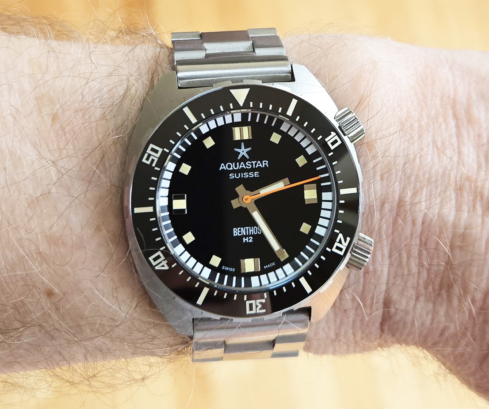 Obviously my answer is totally subjective. My wrist is 6.75 inches and is very flat. I also can’t wear any kind of strap for very long as they cause my wrist to itch and I’d end up with a rash so it’s bracelets for me and my favorite is the cheap $20 Amazon one you see in most of the images here. Also as I’ve got older my preference for watches has changed. I’ve always been the flat caseback guy but I’ve added: make it thinner to that now. It may not come as much of a surprise but all four of the modern Benthos versions wear similarly well but if I wanted one that wears as close to the vintage Benthos 500 as you could get then it has to be the H1.