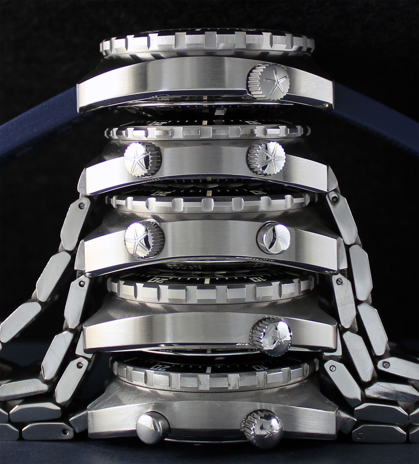 The following image shows the watches with the oldest at the bottom and the newest at the top. I’ve included the new blue H1 because there are a few subtle differences to the H1 from 2023. I’ll show the first one here. The new H1 crown has changed. Look at the image below. You will notice that all the crowns are polished except the one on the top watch. If you look closely you will see that the crown is brushed and it is only the Aquastar star that is polished.